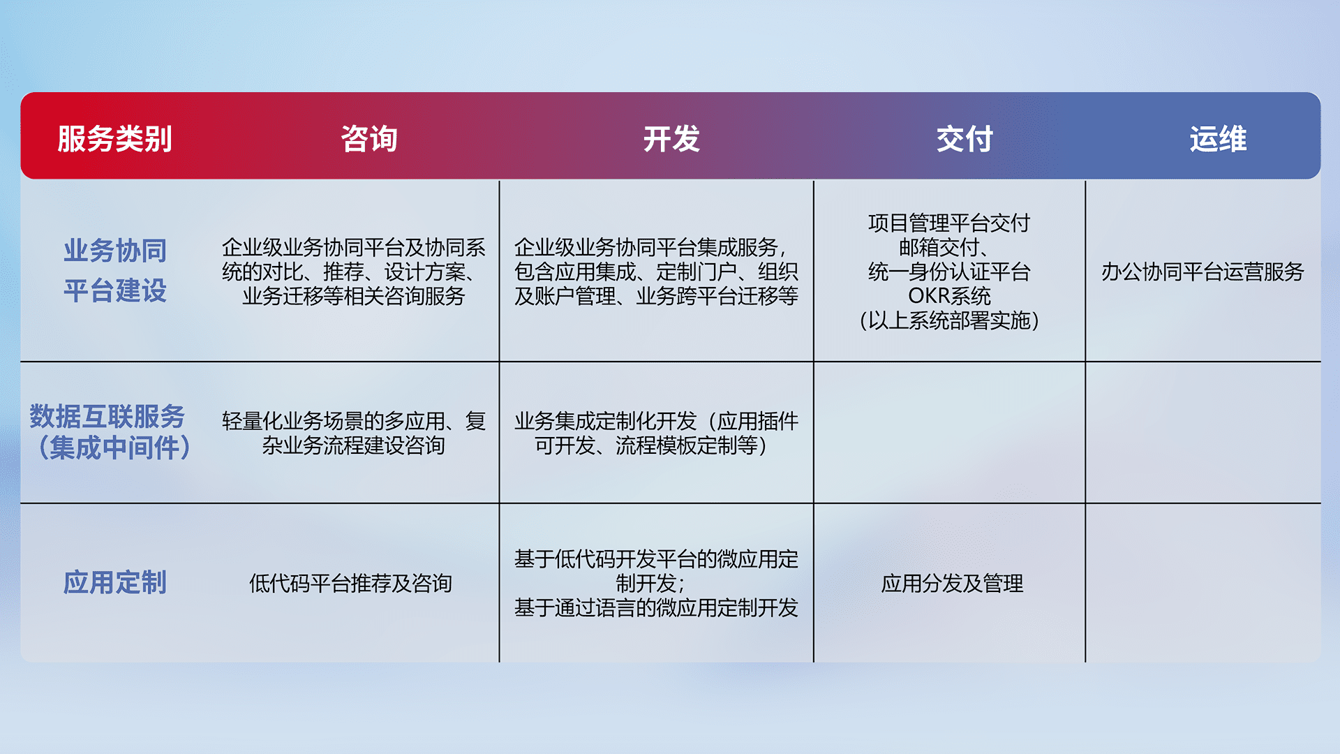 针对钉钉、、、、企微、、、、IDaas等平台级产品提供产品的规划、、、方案、、交付、、定制化开发等服务,,,,实现如统一协同办公、、、智能客户服务、、、、混合会议管理、、智能数据查询、、等业务场景,,,,实现数字化转型。。