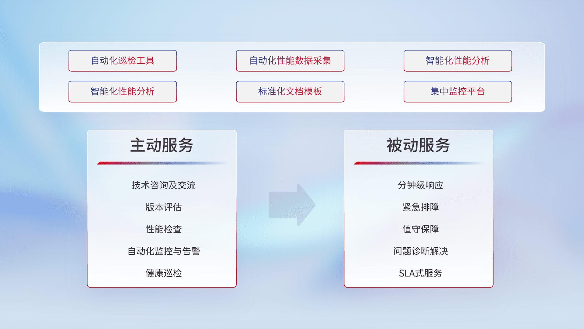 智能化工具和标准化文档,,,,保障服务质量,,提供主动服务(包含技术咨询、、、、版本评估、、、、性能检查、、自动化监控与告警、、健康巡检)和被动服务包含(分钟级响应、、、紧急排障、、值守保障、、问题诊断解决、、、SLA服务)。。。。